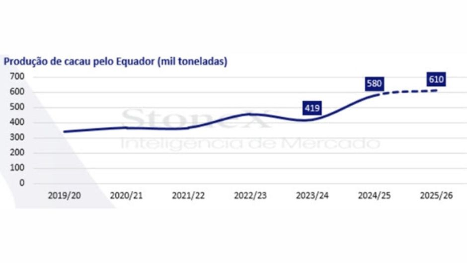 Enquanto o Oeste Africano lida com adversidades, países de outras regiões vêm se beneficiando de condições mais estáveis. O Equador, impulsionado por dois anos consecutivos de clima úmido e investimentos em manejo, deve encerrar a safra 2024/25 com alta de 38%, chegando a 580 mil toneladas, com a capacidade de alcançar 610 mil toneladas já em 2026/27. “O país tem contado com um regime de chuvas consistente e variedades híbridas mais resistentes a doenças. A atenção agora se volta para o risco do fenômeno La Niña, que tende a reduzir as precipitações e pode limitar o ritmo de expansão”, observa o analista de Inteligência de Mercado da StoneX, Lucca Bezzon.