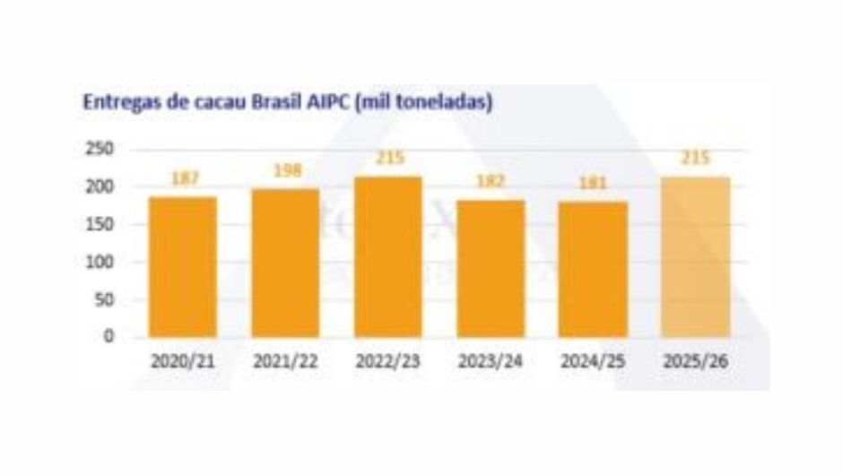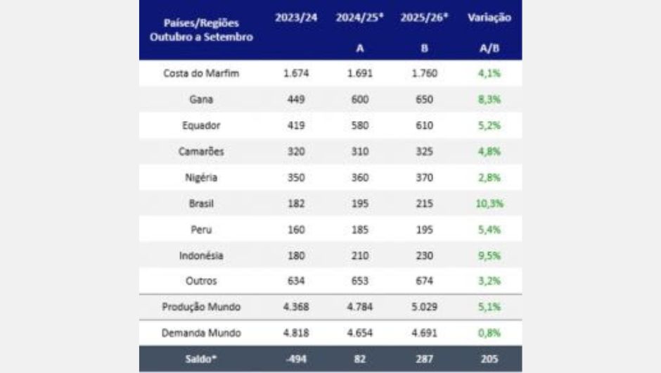 Outros produtores também contribuem para o equilíbrio global, como Camarões, que deve colher 310 mil toneladas, ainda sob risco de aumento da podridão-preta, nome genérico para doenças de plantas causadas por fungos ou bactérias, que resultam em descoloração escura e deterioração. Na Nigéria, apesar do país enfrentar seca persistente e níveis de umidade do solo nas mínimas em cinco anos, a produção deve se encerrar próxima a 360 mil toneladas; já a Indonésia mantém dois anos consecutivos de clima positivo, o que sustenta o crescimento da produção com projeção de 210 mil toneladas.