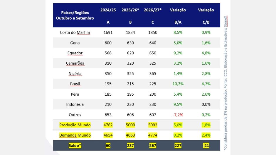 “Com isso, a StoneX revisou a safra 2025/26 com aumento da oferta na Costa do Marfim, leve ajuste negativo em Gana e redução da demanda global. A produção mundial foi revisada para baixo, assim como a demanda, mantendo o saldo global em 287 mil toneladas”, realça o analista de Inteligência de Mercado da StoneX, Rafael Borges.
