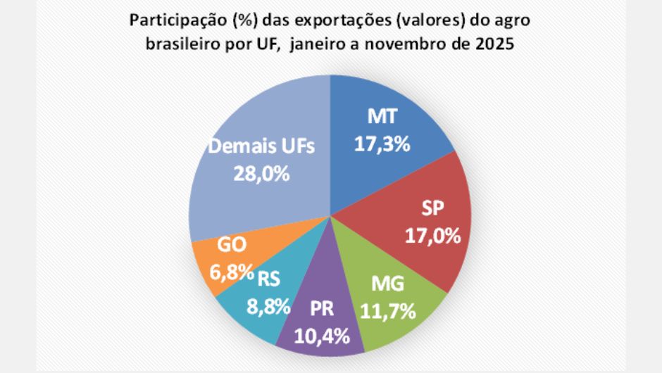 O tarifaço norte-americano foi iniciado em agosto, as exportações para o país apresentaram recuo: em agosto de 14,6%, setembro 32,7%, outubro 32,8% e em novembro a queda foi de 54,9%. Mesmo assim, os Estados Unidos continuam sendo os terceiros maiores compradores do agro de São Paulo.