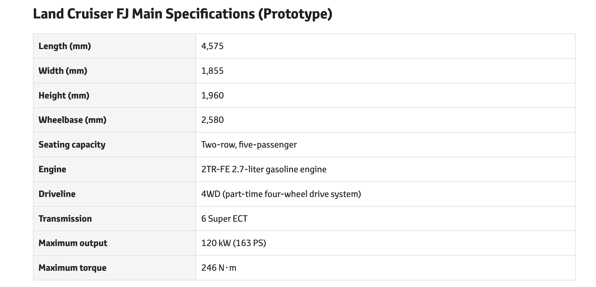 Com 4.575 mm de comprimento e entre-eixos de 2.580 mm, o FJ é mais curto que a série 250, o que melhora sua manobrabilidade. A altura é de 1.960 mm e a largura, de 1.855 mm. O modelo acomoda até cinco ocupantes em duas fileiras.