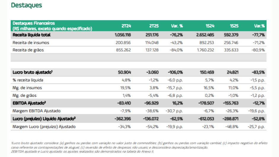 O lucro bruto ajustado ficou negativo em R$ 3 milhões, ante R$ 51 milhões positivos no 2T24. A margem bruta ajustada consolidada ficou em -1,2% (vs. 4,8% no ano anterior) e, no segmento de insumos, em 3,8% (vs. 19,5% no 2T24). O Ebitda ajustado foi negativo em R$ 97 milhões, ainda influenciado pela queda na receita e no volume faturado.