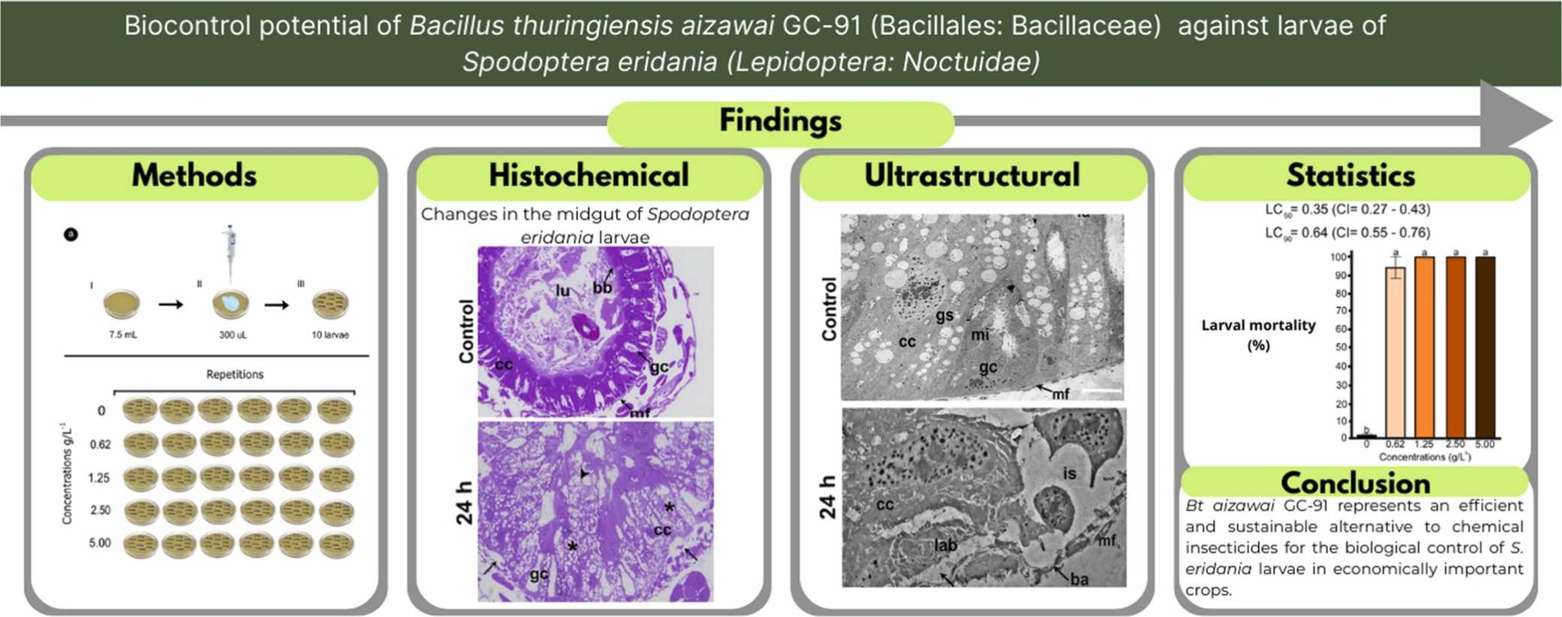 Bacillus thuringiensis subespécie aizawai GC-91 apresentou forte ação contra larvas recém-eclodidas de Spodoptera eridania. O microrganismo causou mortalidade total em até 168 horas e promoveu danos severos no intestino médio das lagartas, segundo estudo conduzido por pesquisadores da Universidade Estadual de Maringá, no Paraná.