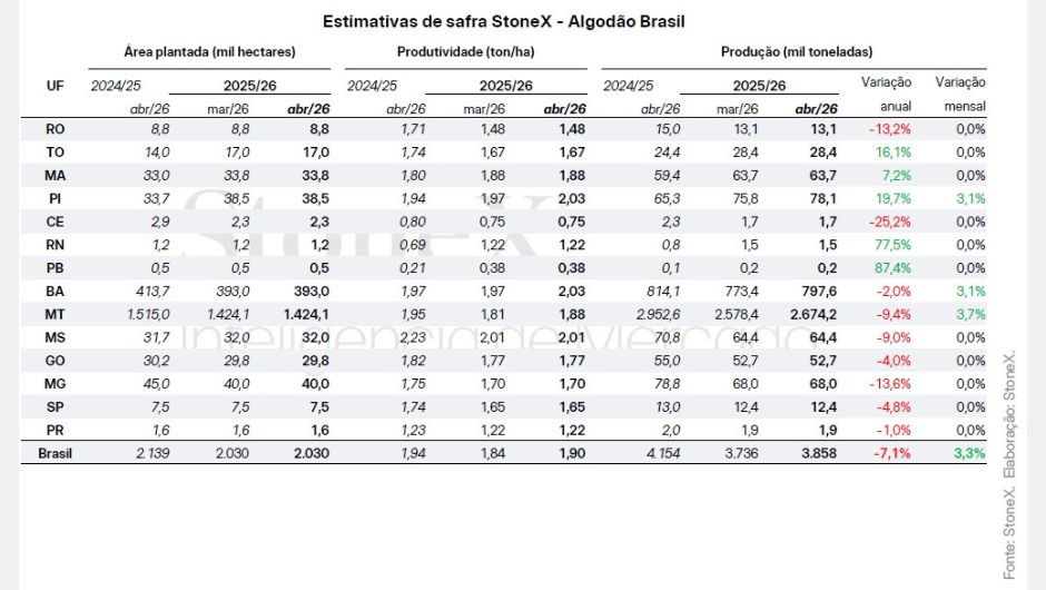 A StoneX revisou para cima sua estimativa para a safra brasileira de algodão 2025/26, elevando a produção total para 3,86 milhões de toneladas. O ajuste é sustentado pelo bom desempenho climático nas principais regiões produtoras, especialmente Bahia e Mato Grosso.
