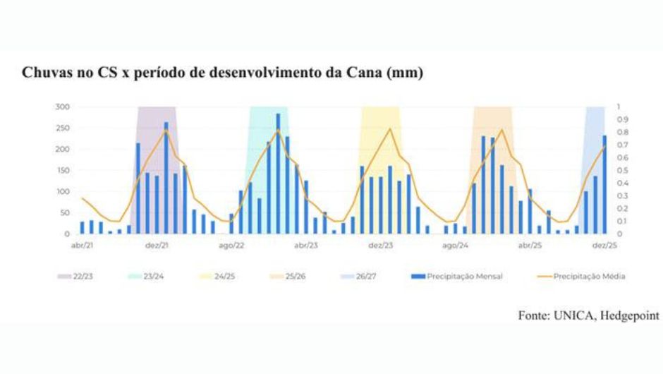 “Uma parte significativa desse excedente vem de outro forte desempenho do ciclo atual do Brasil, juntamente com a melhora nos resultados em todo o Hemisfério Norte. A safra 2025/26 do Centro-Sul brasileiro está terminando, sinalizando uma robusta produção de açúcar. Atualmente, estimamos aproximadamente 610 Mt de cana – aproximando-nos de nossa primeira estimativa, com um mix de 50,6% de açúcar, resultando em cerca de 40,5 Mt de produção de açúcar”, explica Lívea Coda, coordenadora de Inteligência de Mercado da Hedgepoint Global Markets.