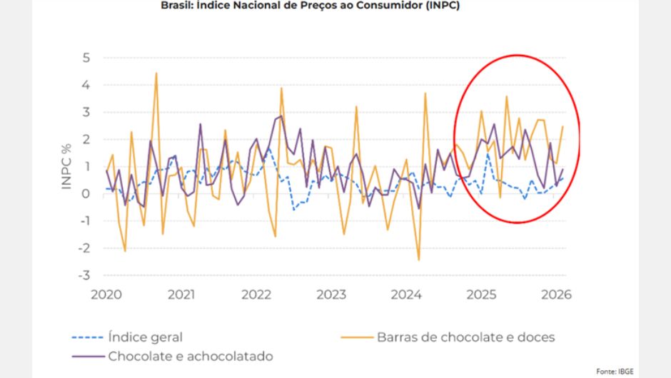 Os indicadores de preços reforçam esse cenário. Na Europa, produtos à base de cacau atingem os maiores níveis dos últimos anos. Nos Estados Unidos, os índices de preços ao produtor e ao consumidor seguem elevados, apesar de correções recentes. No Brasil, produtos como chocolate em barra e doces registraram variações acima do Índice Nacional de Preços ao Consumidor (INPC), indicando que o consumidor ainda deve encontrar preços mais altos nesta Páscoa.