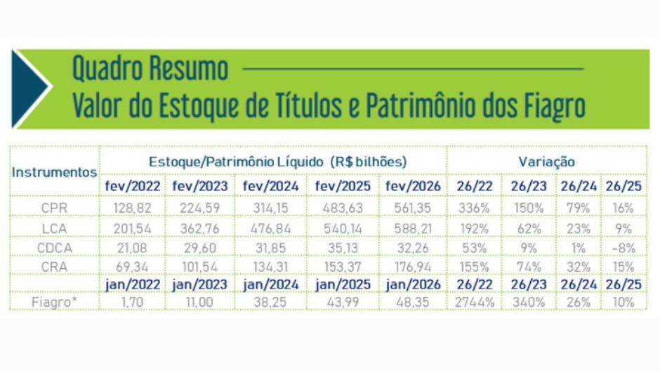 Vale mencionar que, desse estoque de LCA, no mínimo 60% do valor deve obrigatoriamente ser reaplicado pelas instituições financeiras emissoras no financiamento rural. Em fevereiro, o valor total a ser reaplicado chegou a R$ 352 bilhões, indicando aumento significativo de 31% em comparação ao verificado no mesmo período de 2025.