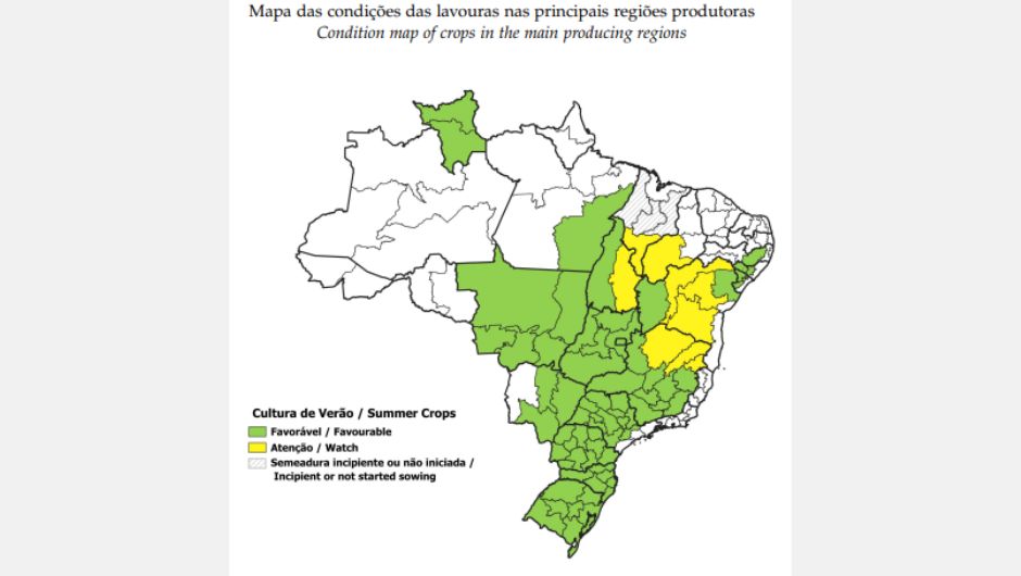 No Norte, o comportamento das chuvas foi bastante variável. Rondônia, sudeste do Pará e região ocidental do Tocantins registraram chuvas irregulares e de baixo volume, enquanto o Amazonas e o oeste do Pará tiveram melhora nas condições de umidade, favorecendo o plantio da soja no sudoeste paraense.
