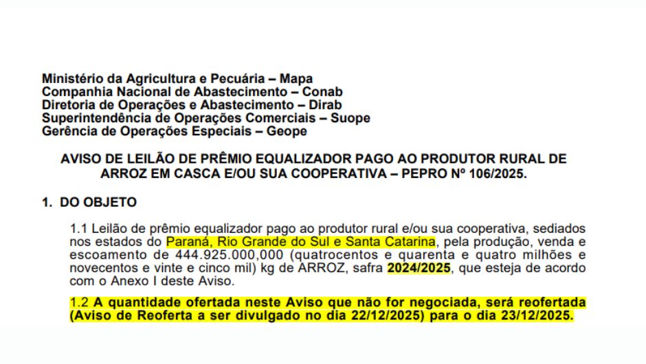 Logo em seguida a Conab realiza o pregão de Prêmio para Escoamento de Produto (PEP) com o saldo remanescente do que foi comercializado no Aviso 104. Ao fim dos leilões de trigo, as operações serão voltadas para os produtores e comerciantes de arroz. A Conab pretende negociar um total aproximado de 444,92 mil toneladas do grão da safra 2024/25. Assim como na operação anterior, o primeiro pregão será de Pepro, o volume não negociado será ofertado logo em seguida por meio de PEP.