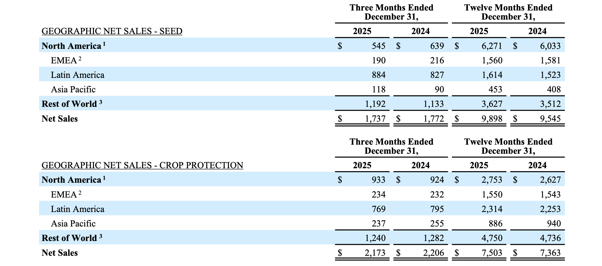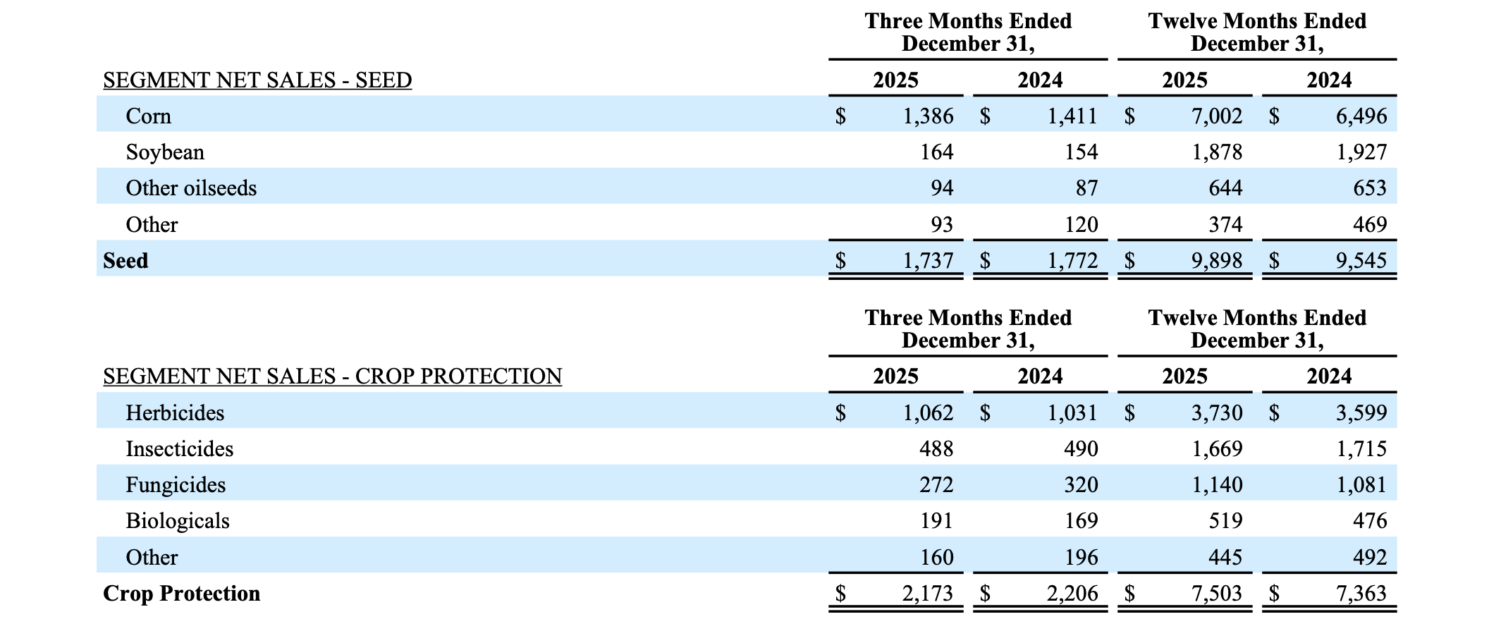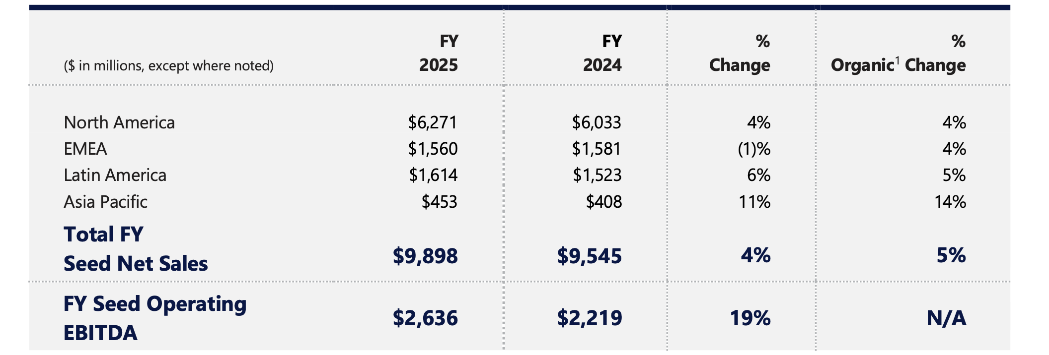 O desempenho de sementes sustentou o resultado anual. As vendas do segmento cresceram 4% e atingiram US$ 9,9 bilhões. As vendas orgânicas avançaram 5%. O preço e o mix subiram 3%, impulsionados por tecnologias mais recentes e estratégia de preço por valor. O volume aumentou 2%, com destaque para milho na América do Norte e no Brasil. O EBITDA operacional do segmento alcançou US$ 2,64 bilhões.