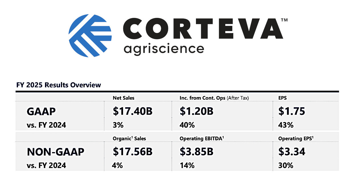 A Corteva encerrou 2025 com crescimento de vendas, avanço em sementes e proteção de cultivos e forte geração de caixa. A empresa registrou receita líquida de US$ 17,4 bilhões, alta de 3% em relação a 2024. As vendas orgânicas cresceram 4%, com ganhos em todas as regiões. O lucro líquido das operações continuadas foi de US$ 1,20 bilhão.