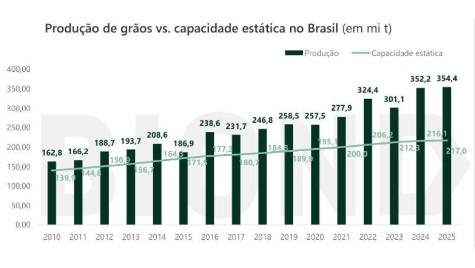 Apesar de os números agregados sugerirem relativa suficiência, a realidade operacional é distinta. A produção brasileira se concentra em janelas curtas, especialmente entre março e junho, quando a colheita da soja se sobrepõe ao avanço do milho. Nesse período, armazéns já ocupados, gargalos logísticos e limitações operacionais reduzem drasticamente a capacidade efetivamente disponível.
