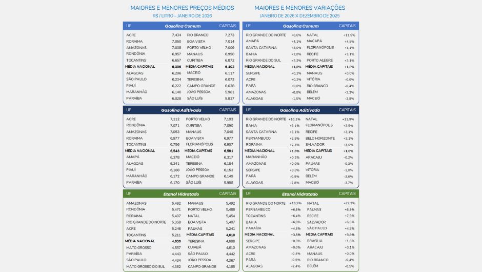 No recorte de 12 meses encerrados em janeiro de 2026, três combustíveis apresentaram aumento médio de preços no País: etanol hidratado (+8,4%), gasolina comum (+2,3%) e gasolina aditivada (+2,3%). Em sentido oposto, os preços médios nacionais do GNV (-4,9%), do diesel S-10 (-0,6%) e do diesel comum (-0,9%) acumularam recuos no período.