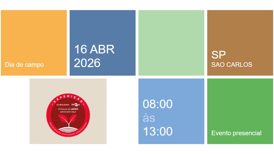 A Embrapa Pecuária Sudeste, em parceria com a Baldan, promove no dia 16 de abril, das 8h às 13h, em São Carlos (SP), o Dia de Campo “Estratégias para conversão de pastagens degradadas em sistemas produtivos intensificados”. As inscrições são gratuitas e podem ser feitas no site da Embrapa (www.embrapa.br/pt/busca-de-eventos/-/evento/501242).