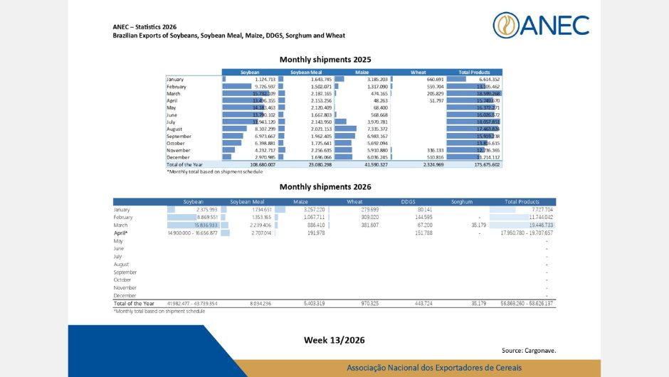 No caso do milho, os embarques seguem a sazonalidade típica do período, com recuo diante da concentração logística na soja. Em março, foram exportadas cerca de 900 mil toneladas, enquanto o line-up para abril aponta 192 mil toneladas.