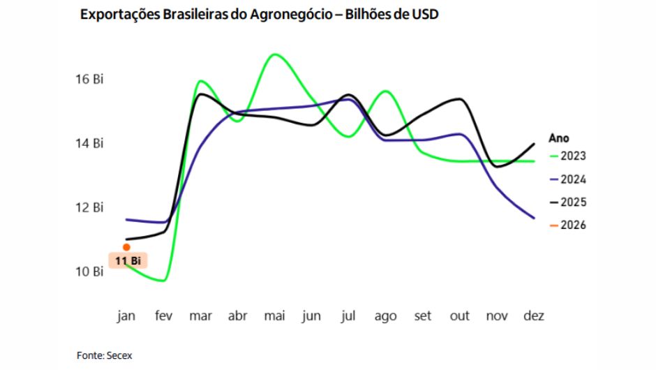 As exportações do agronegócio brasileiro totalizaram US$ 10,7 bilhões em janeiro de 2026, segundo dados da Secretaria de Comércio Exterior (Secex), analisados pela Itaú BBA no relatório Radar Agro de fevereiro. O resultado representa queda de 23% em relação a dezembro de 2025 e recuo de 2,2% na comparação com janeiro do ano passado.