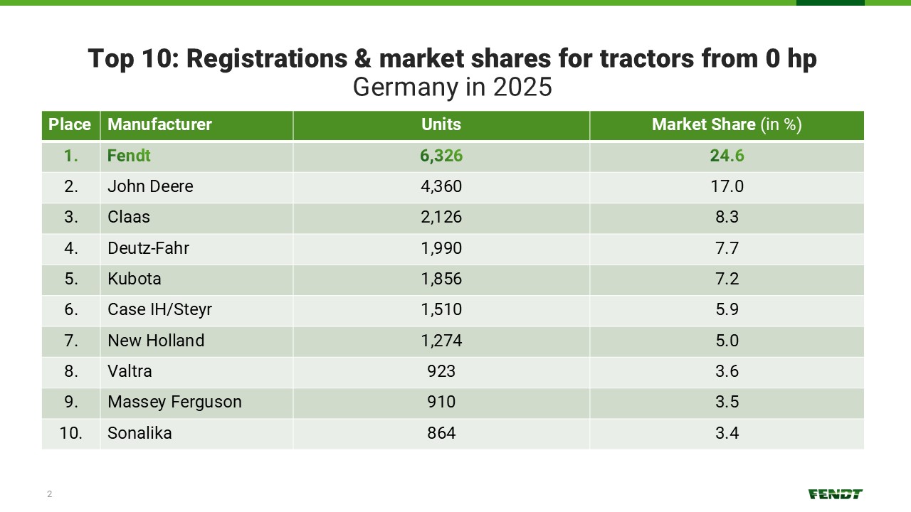 O Fendt 724 Vario liderou o ranking alemão por mais de dez anos, até 2023. Em 2025, manteve a segunda colocação pelo segundo ano seguido. O Fendt 620 Vario entrou no top três pela primeira vez. Em 2024, a terceira posição ficou com o Fendt 516 Vario.