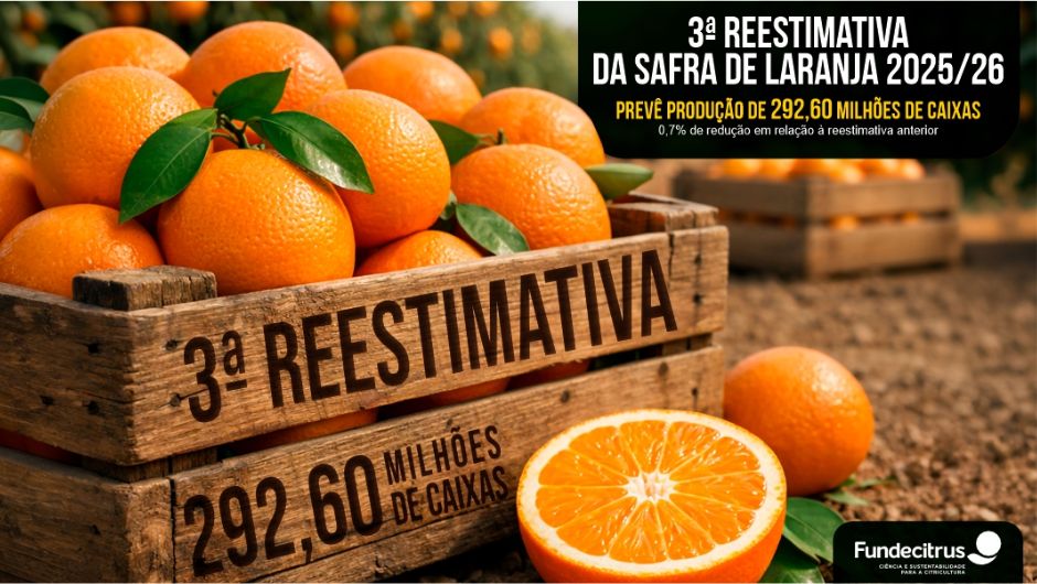 A terceira reestimativa da safra de laranja 2025/26 do cinturão citrícola de São Paulo e Triângulo/Sudoeste Mineiro, divulgada pelo Fundecitrus nesta terça-feira (10/2), indica produção de 292,60 milhões de caixas de laranja de 40,8 kg, redução de 0,7% em relação à segunda reestimativa da safra, divulgada em 10 de dezembro/2025, que apontava produção de 294,81 milhões de caixas, e de 7% em relação à estimativa do dia 9 de maio, que apontava produção de 314,60 milhões de caixas.