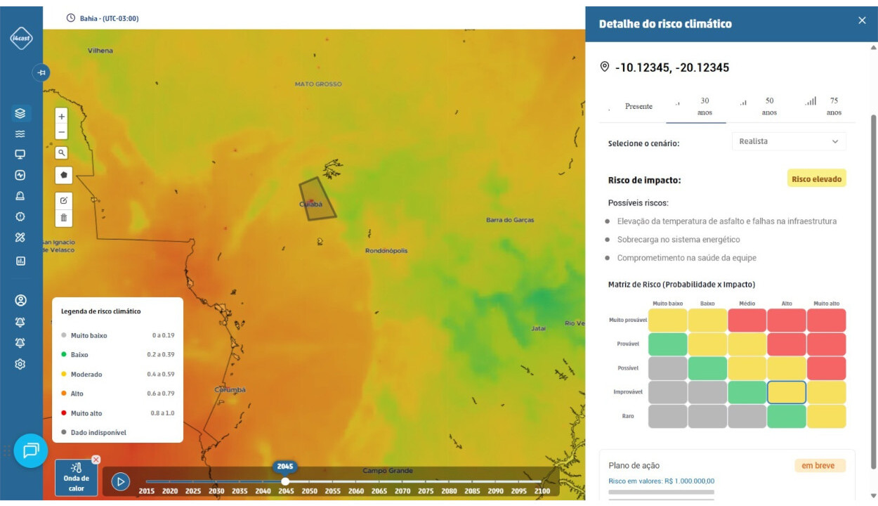 A plataforma da i4sea reúne informações climáticas relevantes para cada operação. O sistema integra dados históricos, medições em tempo real, previsões hiperlocais, análises históricas e registros de ocorrência. A proposta envolve apoiar planejamento e decisão com base em inteligência aplicada ao negócio.