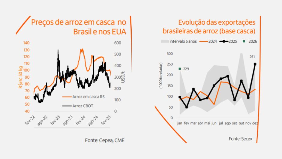 O setor observa com atenção o avanço da safra 2025/26. No Rio Grande do Sul e em Santa Catarina, as lavouras apresentam excelente desenvolvimento, beneficiadas por condições climáticas favoráveis. Contudo, a proximidade do pico da colheita em março, somada a um estoque de passagem estimado em 2,4 milhões de toneladas pela Conab, gera preocupação. Mesmo com uma previsão de produção 13% menor que o ciclo anterior, o mercado lida com o reflexo da sobreoferta acumulada.