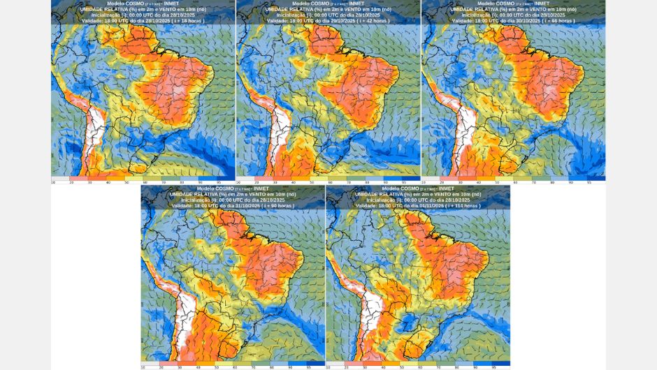 Para a Região Sul, a chuva deve estar dividida em episódios, primeiro até o dia 29, mais concentrada no litoral da região, depois pelo oeste no dia 1 avançando sobre toda a região até o dia 3. São esperados acumulados expressivos, especialmente no Paraná, onde os volumes devem ultrapassar 150 mm. A umidade relativa do ar deve estar baixa em poucos momentos ao longo da semana, com valores abaixo dos 40% em tardes dos dias 30, 31 de outubro, e 1 e 3 de novembro.