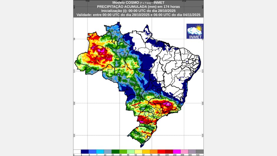 Na previsão do tempo divulgada hoje (28/10), o Instituto Nacional de Meteorologia indica que as chuvas permanecerão distribuídas por quase todo o país entre os dias 28 de outubro e 4 de novembro. Os maiores volumes devem se concentrar sobre o Norte e o Sul do Brasil, com destaque para acumulados acima de 100 mm no Amazonas e no Paraná. No Sudeste e Centro-Oeste, os sistemas frontais e o aumento da umidade favorecem pancadas mais intensas em São Paulo, Rio de Janeiro, Minas Gerais e Mato Grosso do Sul, enquanto parte do Nordeste segue sob tempo seco e baixos índices de umidade, especialmente no interior da Bahia e no oeste da região.