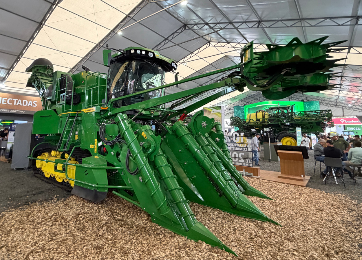 A John Deere apresentou as novas famílias de colhedoras de cana-de-açúcar CH7 e CH9 durante a Agrishow 2026. Os modelos buscam atender demandas do setor sucroenergético por eficiência operacional.