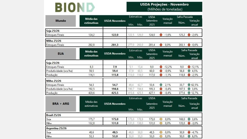 Há ainda a expectativa em torno dos próximos relatórios do USDA (Departamento de Agricultura dos EUA), que voltaram a ser publicados após semanas de paralisação. Se houver revisão moderada para baixo na produtividade americana ou sinalização de exportações mais firmes, Chicago pode responder com valorizações pontuais, aliviando a pressão global.