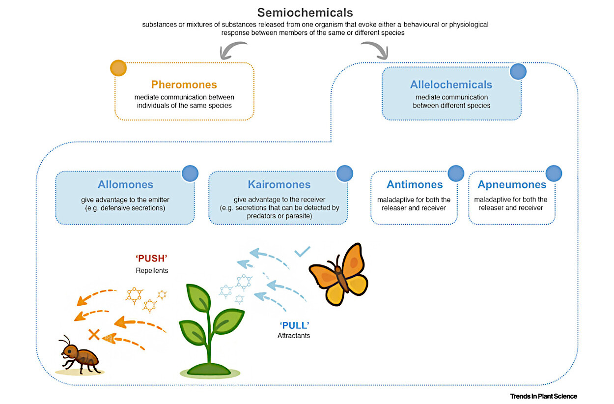 Insetos fitófagos usam sinais químicos para localizar hospedeiros. Compostos voláteis orientam a busca a longa distância. Substâncias de contato confirmam a escolha para alimentação e oviposição. Metabólitos vegetais alteram esses sinais. A interferência gera confusão sensorial e evita colonização.