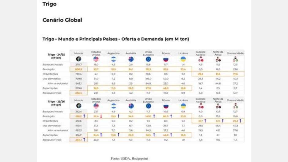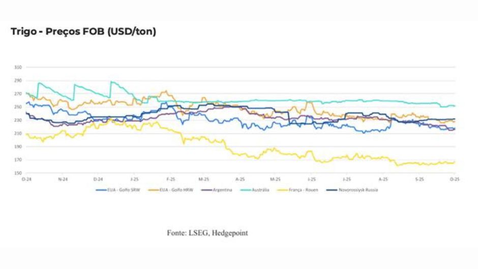 No mercado de trigo, a União Europeia apresenta uma recuperação produtiva significativa, com estimativa de 140 milhões de toneladas e queda nas importações. A Rússia, com impostos de exportação praticamente zerados, reforça a pressão baixista global. A Ucrânia, ainda afetada pela guerra, mantém oferta restrita, enquanto a Argentina inicia a colheita com boas condições e expectativa de exportar até 13 milhões de toneladas — grande parte destinada ao Brasil.