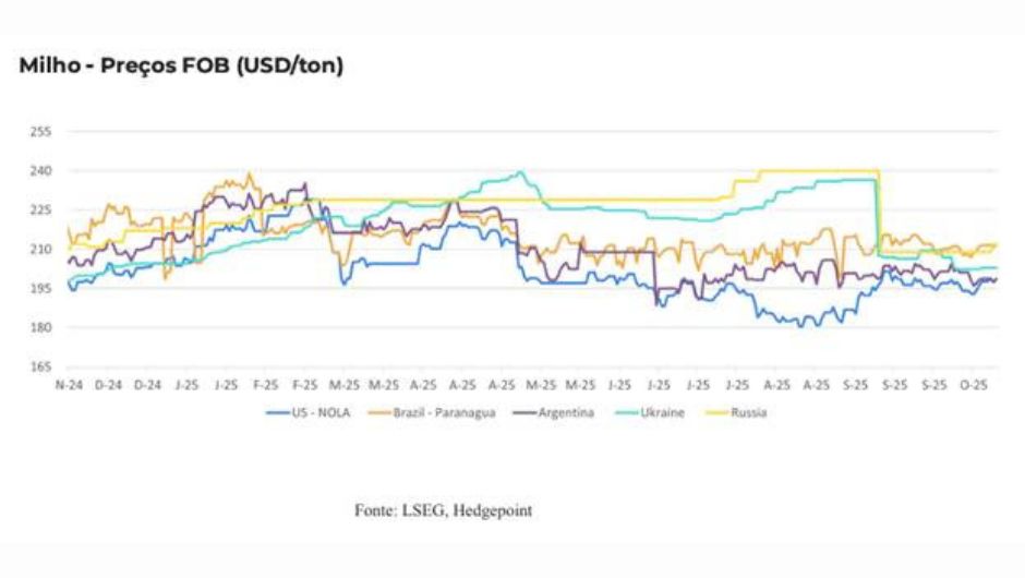 Na Argentina, o aumento de área cultivada e a redução temporária das “retenciones” estimularam vendas intensas, com potencial de exportação de até 37 milhões de toneladas. “Esse movimento, somado à competitividade dos EUA, pressiona o espaço exportador brasileiro”, diz Luiz Fernando Roque, coordenador de Inteligência de Mercado de Grãos & Oleaginosas da Hedgepoint Global Markets.