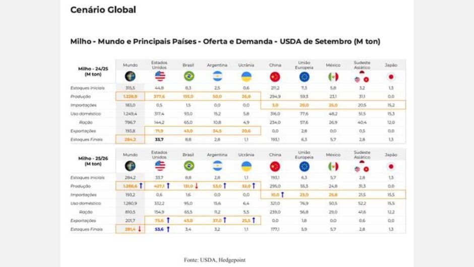 Já o Brasil enfrenta desafios para atingir a meta de exportações, com destaque para o crescimento da demanda interna via etanol de milho, que tem ajudado a absorver parte da oferta local, segundo Thaís Italiani, gerente de Inteligência de Mercado de Grãos & Oleaginosas da Hedgepoint Global Markets.