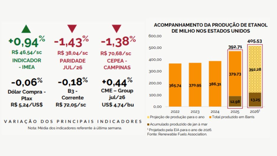 O boletim também destaca o forte ritmo da produção de etanol de milho nos Estados Unidos. Até 20 de março, a produção diária alcançou 1,12 milhão de barris, alta de 2,09% no período e 6,24% acima da média dos últimos três anos.