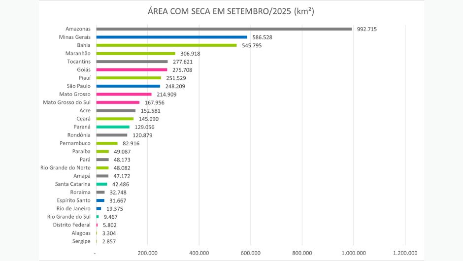 O Amazonas liderou em área total afetada, seguido por Minas Gerais, Bahia, Maranhão e Tocantins. Entre agosto e setembro, o aumento da área com seca foi observado no Ceará, Mato Grosso, Mato Grosso do Sul e Paraná, além do retorno do fenômeno em Amapá e Roraima. Já a redução ocorreu em Alagoas, Pernambuco, Goiás, Amazonas, Rondônia, Rio Grande do Sul e Santa Catarina.