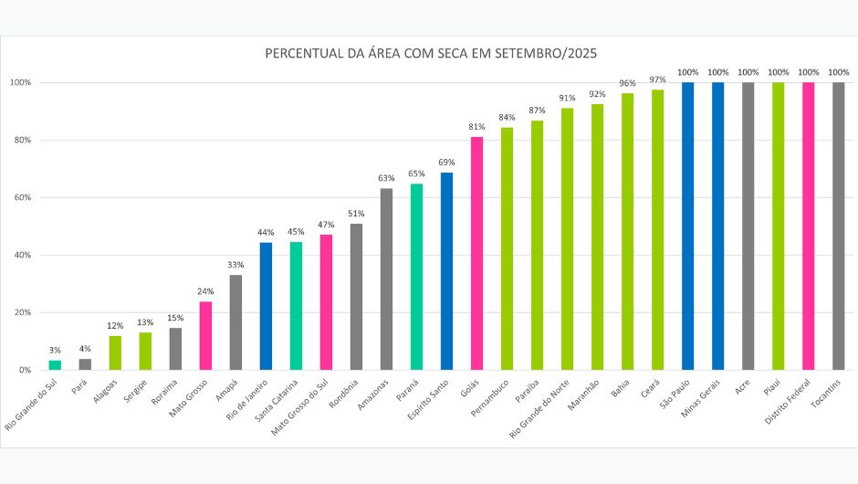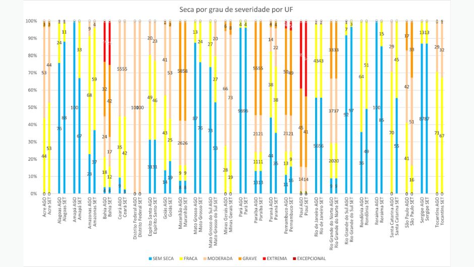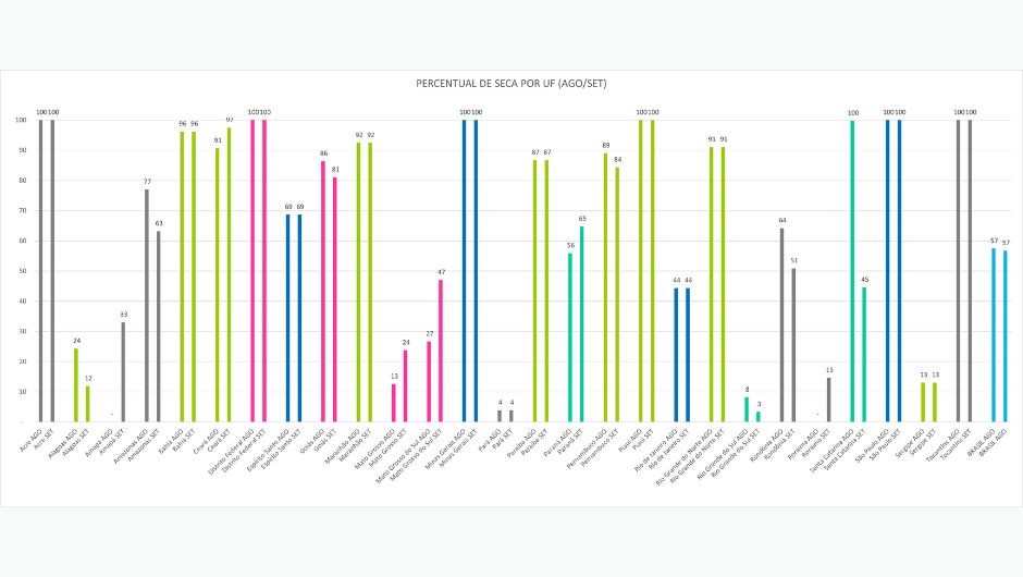 Em setembro, seis unidades da Federação apresentaram seca em 100% de suas áreas: Piauí, Distrito Federal, Minas Gerais, São Paulo, Acre e Tocantins. Nos demais estados, o fenômeno variou entre 3% e 97% do território.