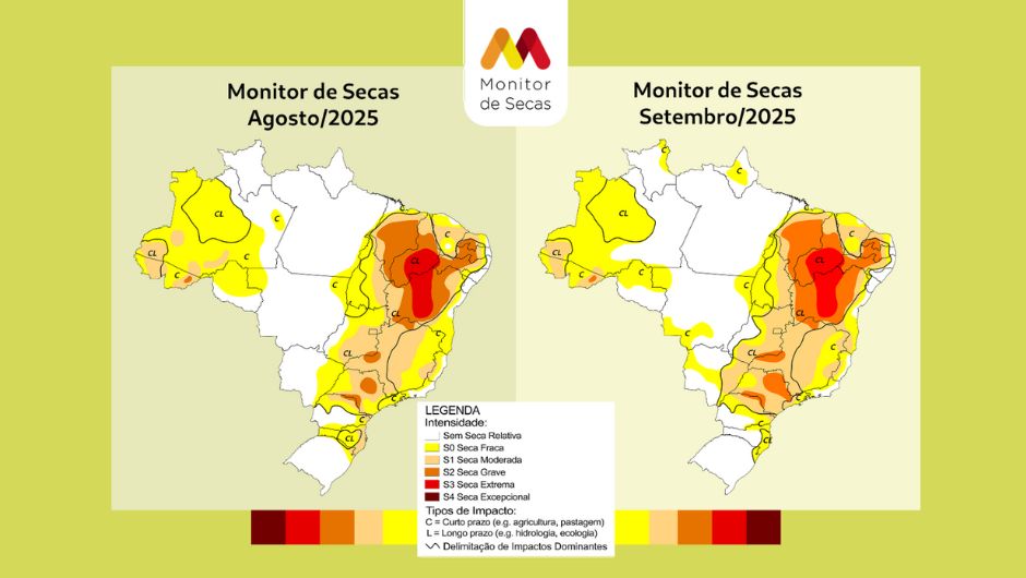 A mais recente atualização do Monitor de Secas, que compara os meses de agosto e setembro de 2025, aponta aumento da severidade da seca em dez estados brasileiros, especialmente nas regiões Centro-Oeste, Nordeste e Sudeste. Em contrapartida, o fenômeno perdeu força no Norte e no Sul, com redução das áreas afetadas.