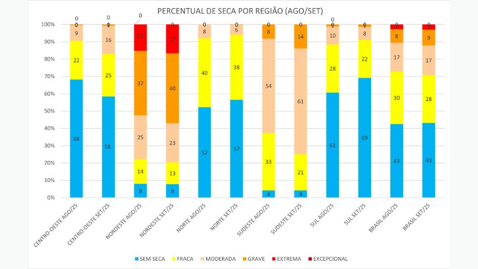 As regiões Centro-Oeste e Sudeste também apresentaram intensificação do fenômeno. Já no Norte, a condição foi considerada a mais branda do país, e no Sul, a situação melhorou, com redução da seca moderada de 10% para 8%.