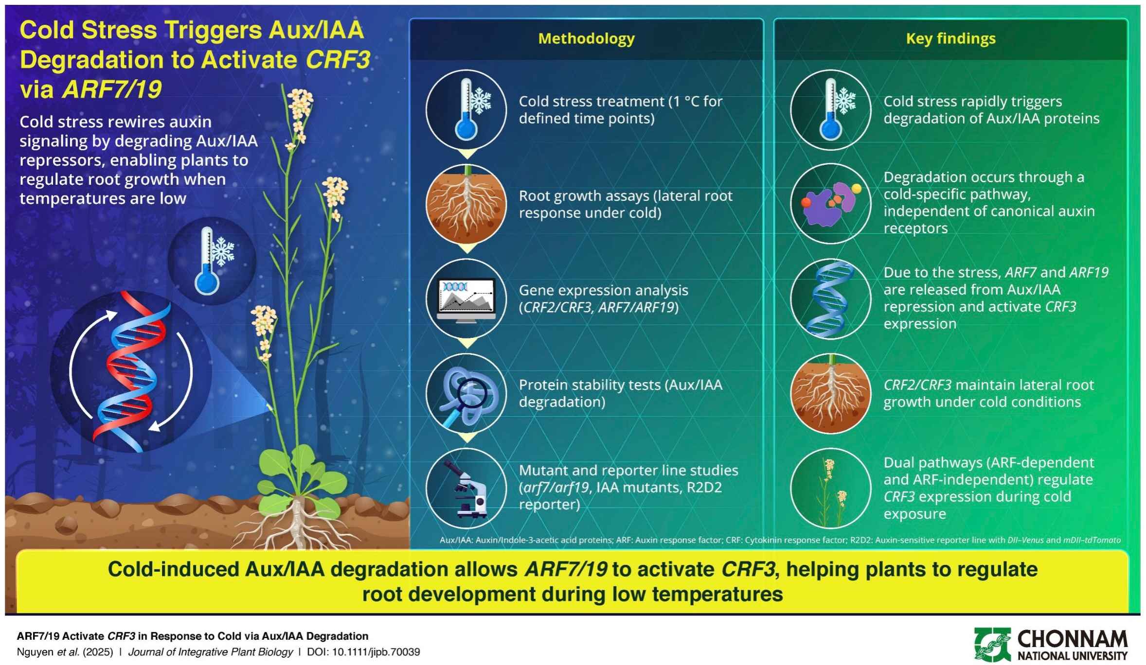 O estudo liderado pelo professor Jungmook Kim, Universidade Nacional de Chonnam, revelou que o estresse por frio reconfigura a sinalização hormonal. As proteínas Aux/IAA normalmente suprimem genes relacionados ao crescimento. Com a degradação induzida pelo frio, ARF7 e ARF19 ganham liberdade para ativar CRF3. Esse gene controla a arquitetura das raízes em condições adversas.