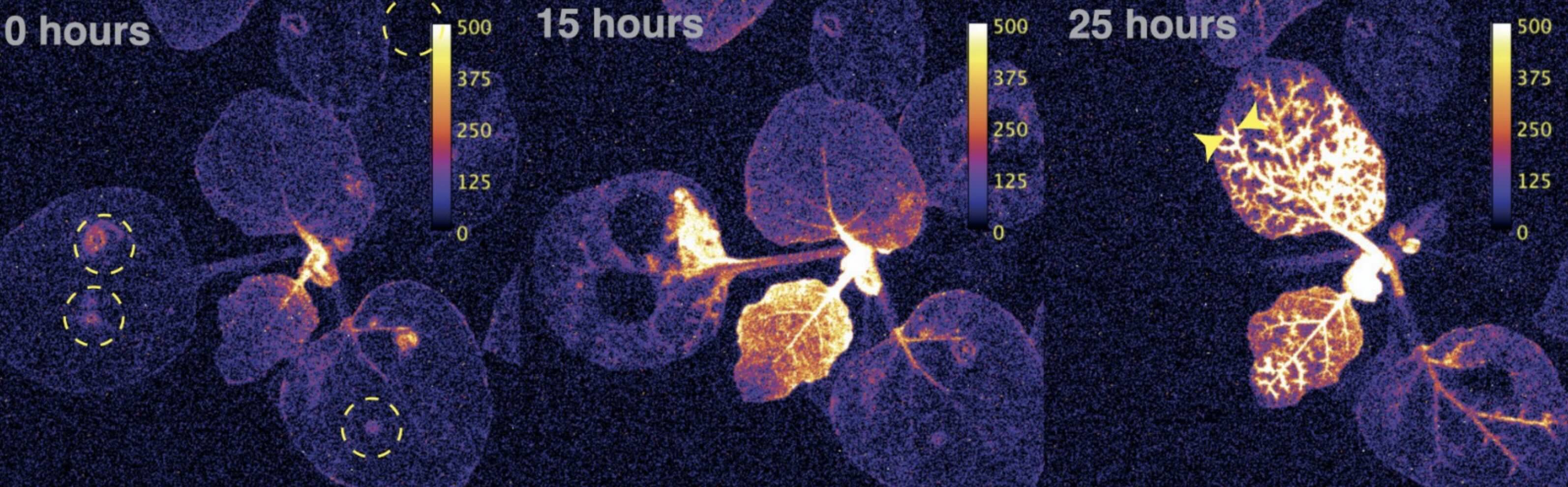 Plantas modelo geneticamente modificadas passaram a emitir luz durante a ativação de respostas de defesa. O sistema permite visualizar, de forma não invasiva, a dinâmica dos hormônios ácido salicílico (SA) e ácido jasmônico (JA) em tecidos vegetais.