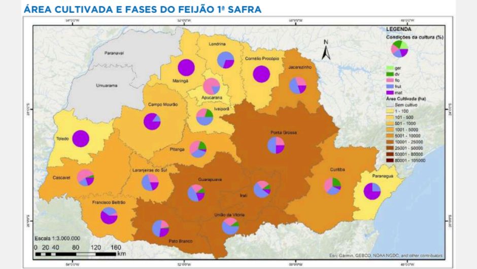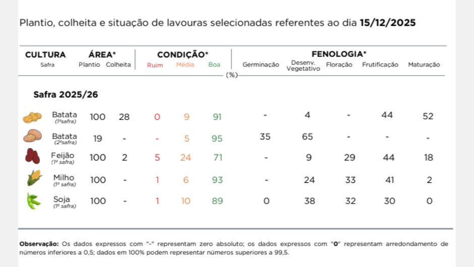 Para o feijão, a colheita teve início em algumas áreas, com produtividade abaixo do esperado até o momento. Em outras regiões, as lavouras estão em maturação ou no final do desenvolvimento. Episódios de granizo e excesso de chuvas em semanas anteriores exigiram replantios pontuais.