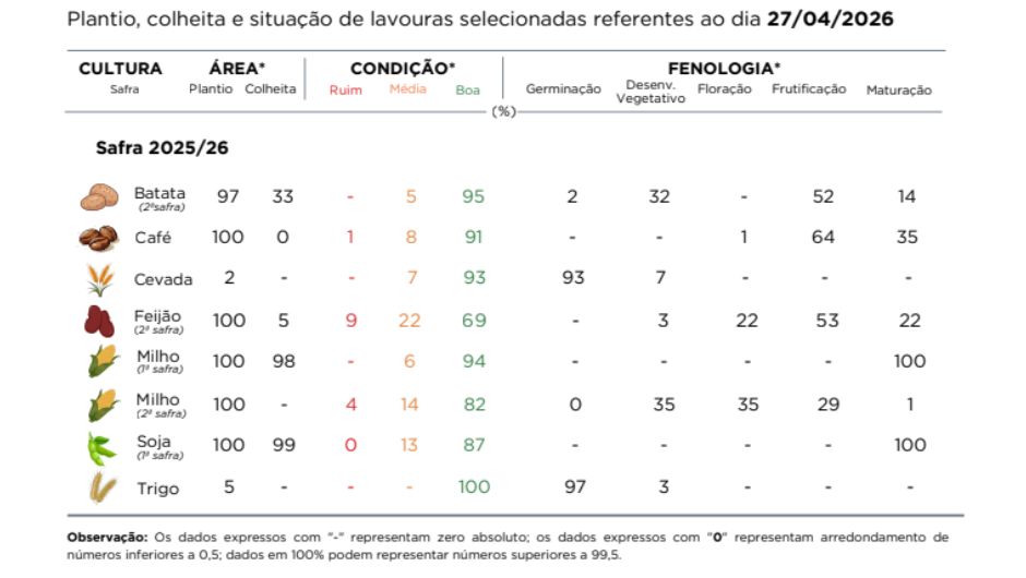 No caso do feijão de segunda safra, já totalmente plantado, a colheita ainda é incipiente, com 5% da área colhida. As lavouras apresentam estágios variados, mas enfrentam perdas devido à irregularidade das chuvas e à incidência de doenças em algumas regiões.
