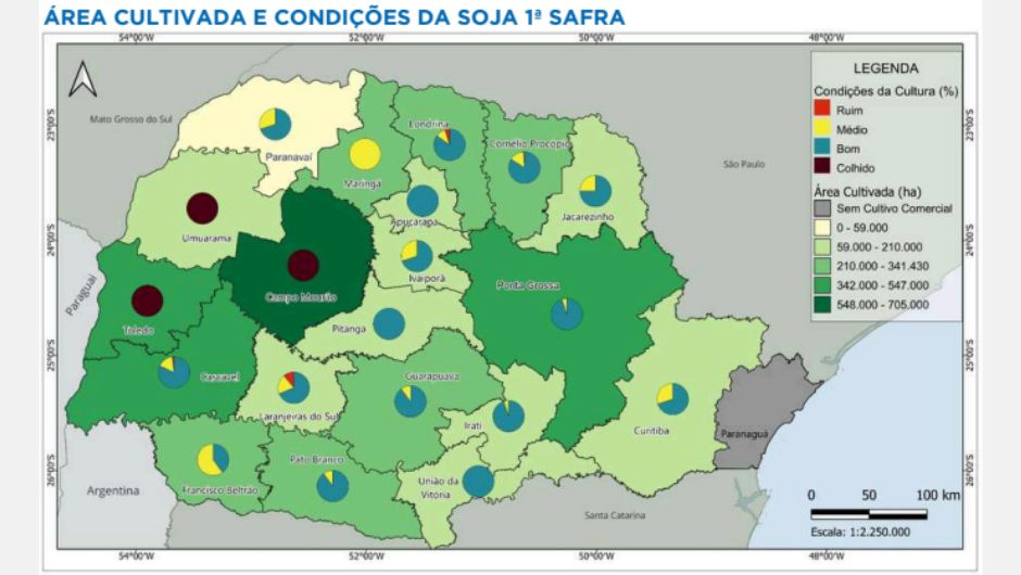De acordo com o Deral, a irregularidade das chuvas, aliada a períodos de estiagem e altas temperaturas, tem comprometido o desenvolvimento das plantas, resultando em estandes desuniformes, baixo porte e redução do potencial produtivo. Há ainda relatos de encrostamento superficial do solo e aumento da pressão de lagartas.