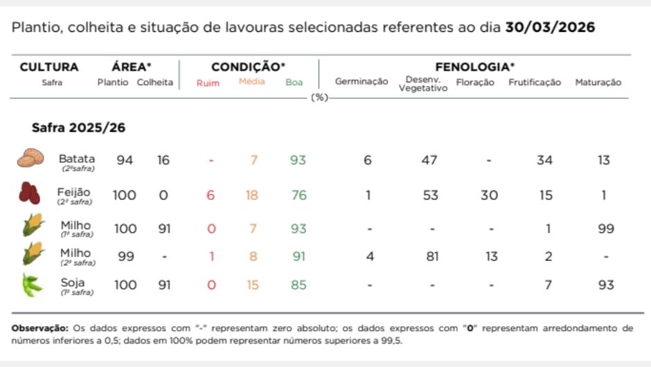 O café apresenta bom desenvolvimento vegetativo e aspecto geral positivo, com expectativa favorável para a próxima safra. Situação semelhante é observada na cana-de-açúcar, que mantém bom desenvolvimento, com colheita prevista para breve.