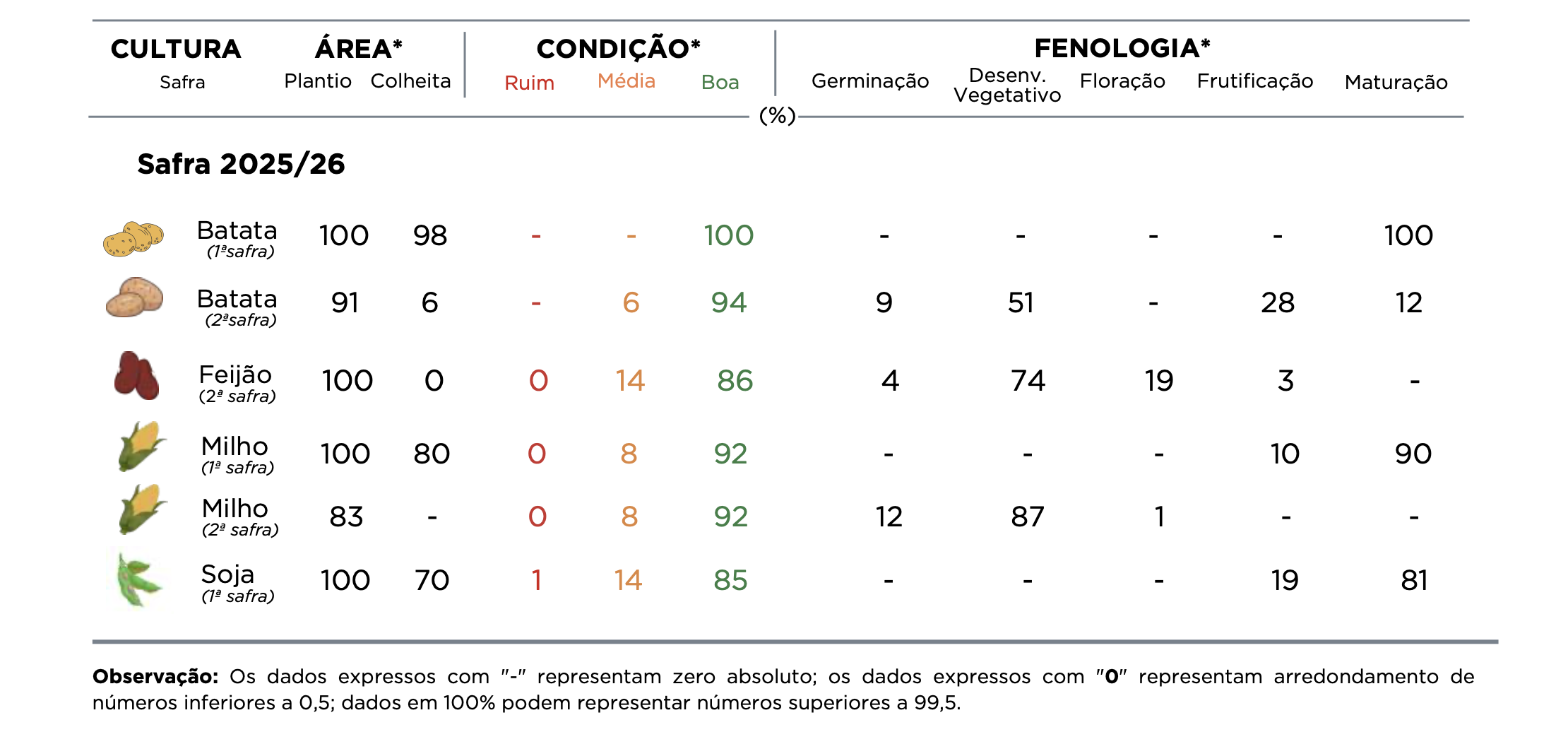 Na batata, áreas da 2ª safra passam por preparo de solo e organização do plantio. No café, lavouras exibem bom aspecto vegetativo e entram em frutificação, com grãos ainda em estágio inicial. Na cana-de-açúcar, o desenvolvimento vegetativo avança em diferentes estágios, favorecido pelas condições climáticas da semana e pelos tratos culturais.