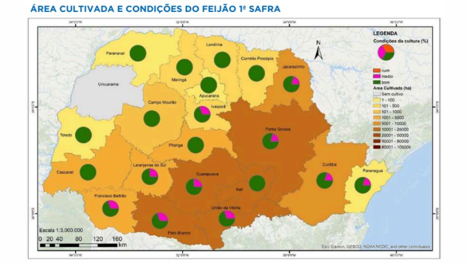 As lavouras de feijão enfrentam dificuldades devido às baixas temperaturas e ao excesso de umidade em várias regiões do estado. O boletim do Deral aponta germinação irregular e crescimento lento das plantas, o que pode comprometer parte da produtividade. Em áreas mais frias, as perdas ainda estão sendo avaliadas, mas o quadro requer atenção dos produtores.