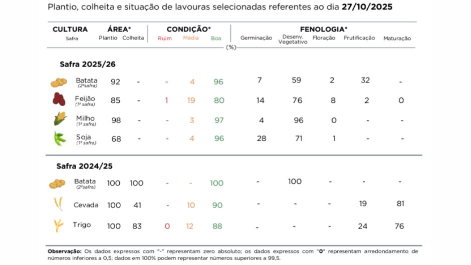 Os tratos culturais seguem em andamento nas lavouras de batata, que têm sido beneficiadas pelas temperaturas amenas, favoráveis à formação dos tubérculos, embora o frio intenso em algumas regiões limite o crescimento das plantas.