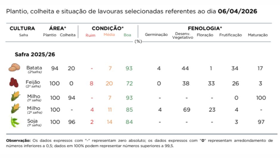 As lavouras estão nas fases iniciais, com germinação e crescimento favorecidos pelas chuvas recentes. Ainda assim, a irregularidade hídrica pode comprometer o estabelecimento em áreas com menor retenção de água.