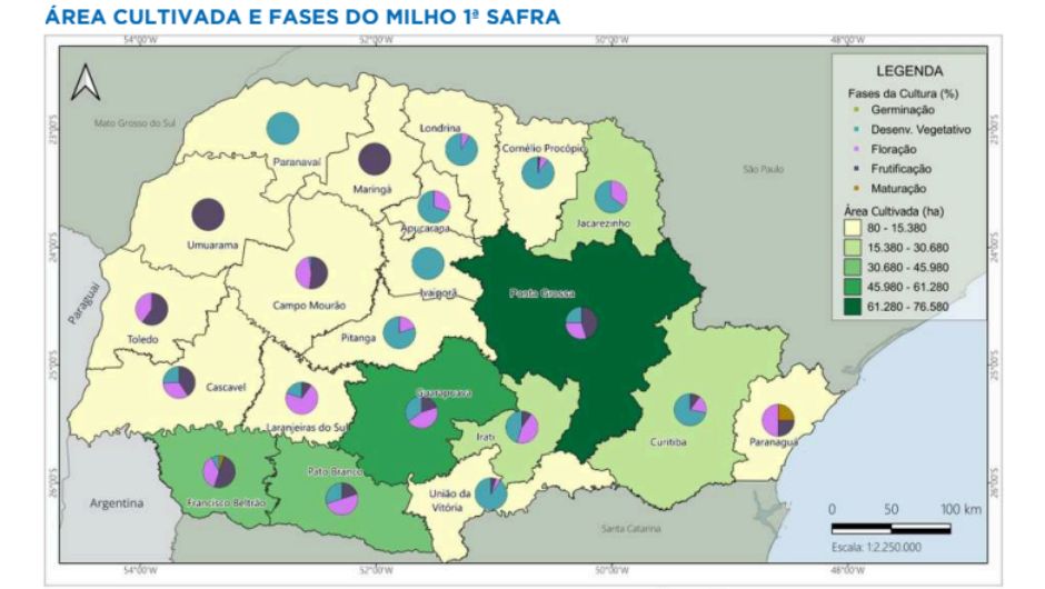 O milho mantém bom desenvolvimento na maioria das regiões, com lavouras entre desenvolvimento vegetativo e floração, e algumas já entrando em frutificação. Áreas atingidas por granizo mostram recuperação adequada. Em regiões mais quentes, o calor aliado à falta de chuvas reduziu temporariamente o ritmo de crescimento, mas o potencial da safra ainda não foi comprometido.