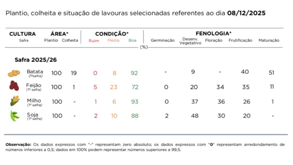 O feijão tem desenvolvimento satisfatório em grande parte do estado. Áreas precoces avançam para floração e frutificação, enquanto lavouras tardias seguem em fases iniciais. Pequenas áreas já iniciam a colheita, com expectativa de boa qualidade. Regiões atingidas por granizo mostram recuperação adequada, sem necessidade ampla de replantio.