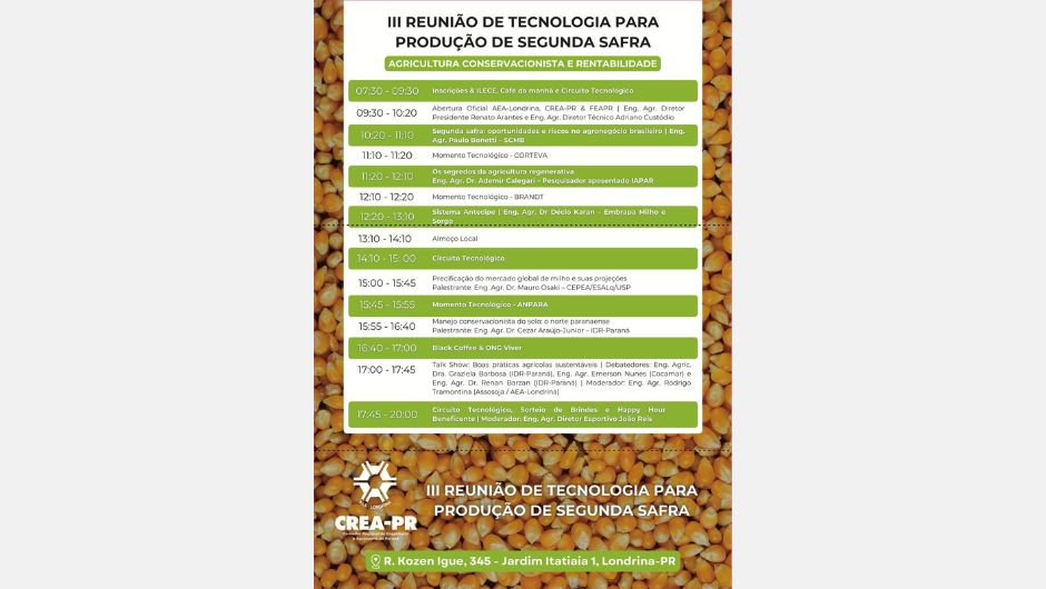 O coordenador e idealizador do encontro, engenheiro agrônomo Adriano Custódio, reforça que a programação reúne especialistas reconhecidos pela atuação em manejo e conservação. “O evento traz meios inovadores para fortalecer a rentabilidade da segunda safra e orientar o produtor para um futuro mais sustentável”, avalia.
